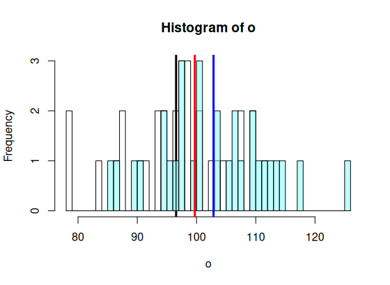 > m.tot [1] 99.71228 > m.o [1] 96.55324 > m.p [1] 102.8713 > ss.o [1] 2179.19 > ss.p [1] 2605.623 > > hist(o, breaks=br, + col=rgb(1,1,1,.5)) > abline(v=m.o, col="black", lwd=3) > hist(p, add=T, breaks=br, + col=rgb(.5,1,1,.5)) > abline(v=m.p, col="blue", lwd=3) > abline(v=m.tot, col='red', lwd=3) > > ss.bet <- n.o*(m.tot-m.o)^2 + n.p*(m.tot-m.p)^2 > ss.bet [1] 598.7747 >