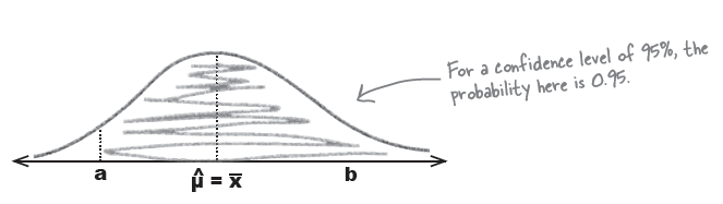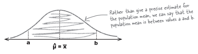 즉, 샘플의 평균을 Point estimate로 사용하고, 그 지점을 중심으로 95%의 확률을 가지는 구간을 구해 population의 평균으로 삼는다. 이 구간을 신뢰구간이라고 한다.