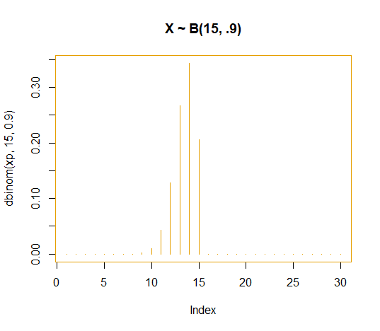 xp <- c(1:30) plot(dbinom(xp, 15, .9), type = "hist")