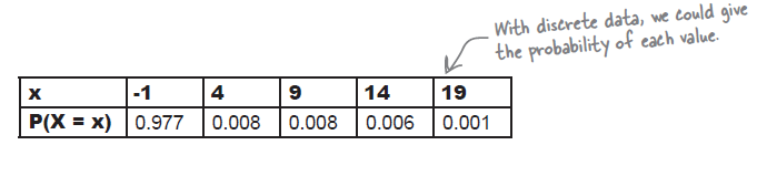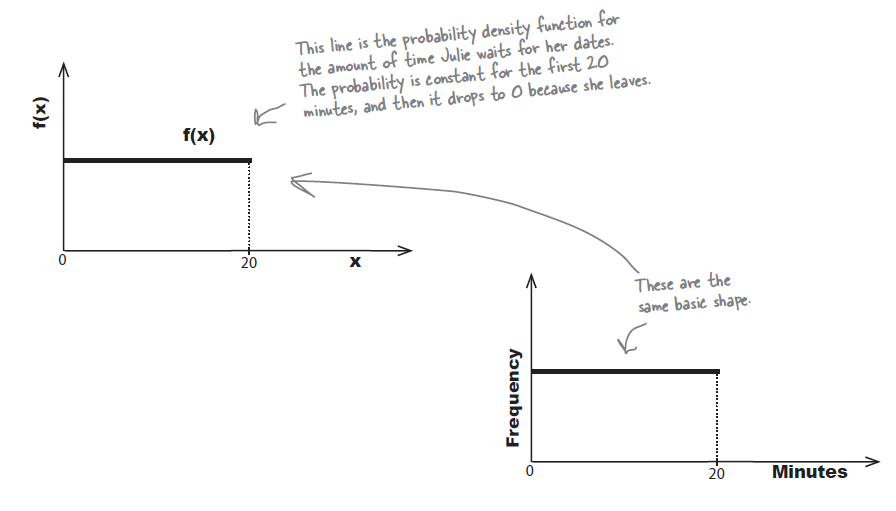 20분 동안만 기다리고 그 직후 떠나버리는 줄리의 상황에서 20분 동안의 시간 중에서 5분이상을 기달릴 확률을 구하는 것은 이산데이터와는 다른 성격을 갖는다. 아래는 베팅에서의 상금을 기초로 각 상황에 (discrete situation) 맞는 확률을 구하여 전체를 파악하는 것이지만, 시간의 경우는 이와 같은 방법을 수행할 수 없다.