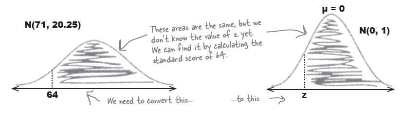 평균과 표준편차 값이 0, 1이 아닌 다른 값을 같는 분포는 0, 1 이 되도록 변환한 후에 probability를 구한다 (표준점수화).