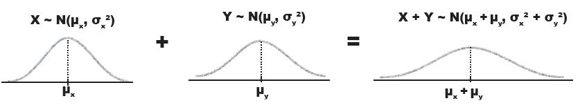 | $X + Y$ $\text{when}$ $X \sim N(\mu^{\;}_{X}, \sigma^{2}_{X})$ $Y\sim N(\mu^{ }_{Y}, \sigma^{2}_{Y}) \qquad\qquad $ | $X + Y \sim N(\mu_{X} + \mu_{Y}, \sigma^{2}_{X} + \sigma^{2}_{Y}) \qquad\;\; $ | X, Y events are independent $\qquad$ |