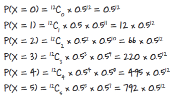 Let’s start off by working this out using the binomial distribution. Use the binomial distribution to find P(X < 6) where X ~ B(12, 0.5).