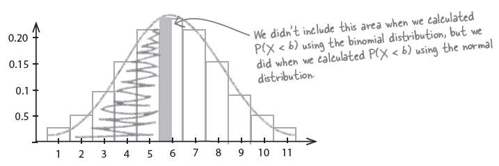 이에 대한 probability는 $P(X < 6) = 0.5$ 이다. 이 값은 앞에서 구한 binomial distribution 계산과 다른 값을 갖는다. 즉, $0.387 \ne 0.5$ 이다. 그 이유는 . . . .