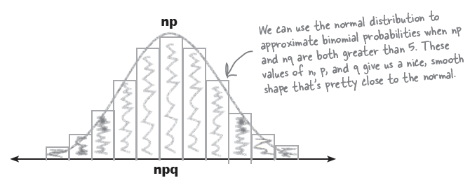 - In particular circumstances you can use the normal distribution to approximate the binomial. If X ~ B(n, p) and np > 5 and nq > 5 then you can approximate X using X ~ N(np, npq)