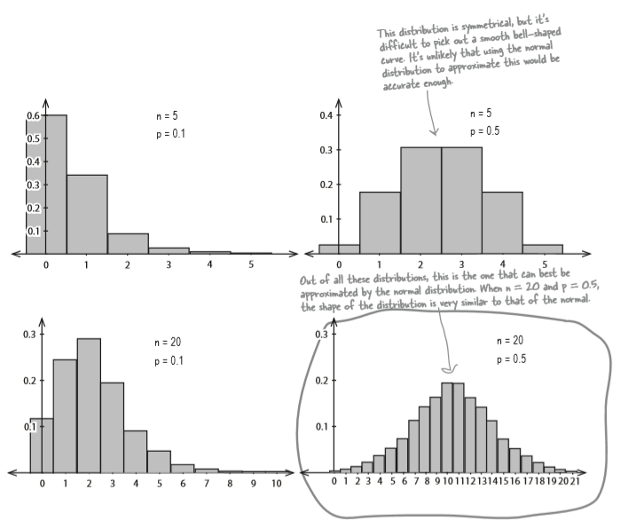 We saw in the last exercise that the binomial distribution looks very similar to the normal distribution where p is around 0.5, and n is around 20. As a general rule, you can use the normal distribution to approximate the binomial when np and nq are both greater than 5.