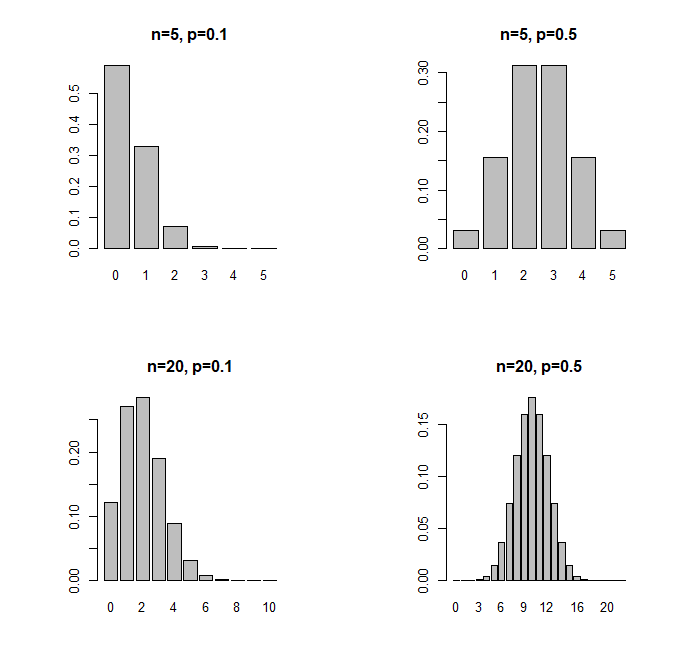n20 <- 20 n5 <- 5 p1 <- .1 p5 <- .5 x <- c(0:30) a <- dbinom(x, n5, p1) c <- dbinom(x, n20, p1) b <- dbinom(x, n5, p5) d <- dbinom(x, n20, p5) par(mfcol=c(2,2)) barplot(a, names.arg=x, main="n=5, p=0.1") barplot(c, names.arg=x, main="n=20, p=0.1") barplot(b, names.arg=x, main="n=5, p=0.5") barplot(d, names.arg=x, main="n=20, p=0.5") par(mfcol=c(1,1))