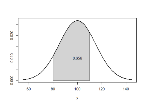 m.s <- 100 sd.s <- 15 lb <- 80 ub <- 110 normal_area(mean = m.s, sd = sd.s, lb = lb, ub = ub, lwd = 2) ar <- round(pnorm(ub, m.s, sd.s)-pnorm(lb, m.s, sd.s),3) text(m.s, .01, ar)
