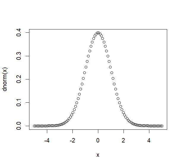 > x <- seq(from=-3, to=+3, length.out=100) > plot(x, dnorm(x))