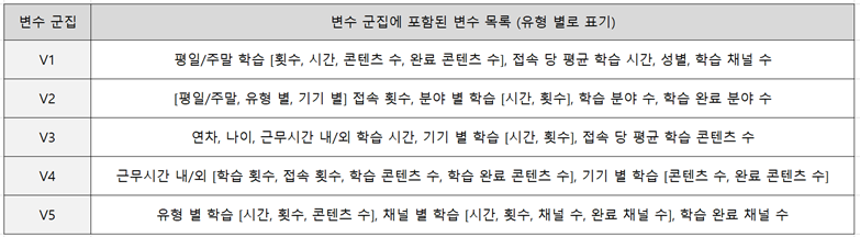 본 연구는 클러스터링에 사용된 각 변수 군집들 내 변수들을 파악하여 변수 군집의 의미를 일반화하여 정의하는 작업을 진행한다. 이는 다음과 같다, (1) V1: 학습 열정 - 학습의 빈도 및 강도에 대한 특성 (2) V2: 학습 다양성 - 다양한 분야의 콘텐츠를 학습하는지에 관한 특성 (3) V3: 학습 능동성 – 학습을 주도적으로 진행하는지 확인하는 특성.