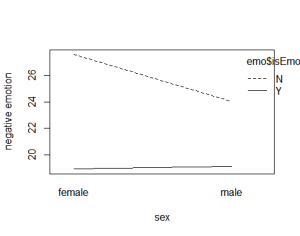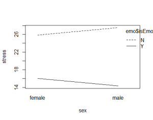 추가적으로 변인간, 즉 이모티콘의 사용 유무와 성별 두 요인간 상호작용효과를 알아보기위해 factorial anova를 해보았다. 그 결과 스트레스와 부정적 정서 모두 성별과는 상관이 없었으며, 성별과 이모티콘의 사용 유무 간의 상호작용효과도 나타나지 않았다.(p>0.05) 이를 시각적으로 표현해보면 아래와 같다.