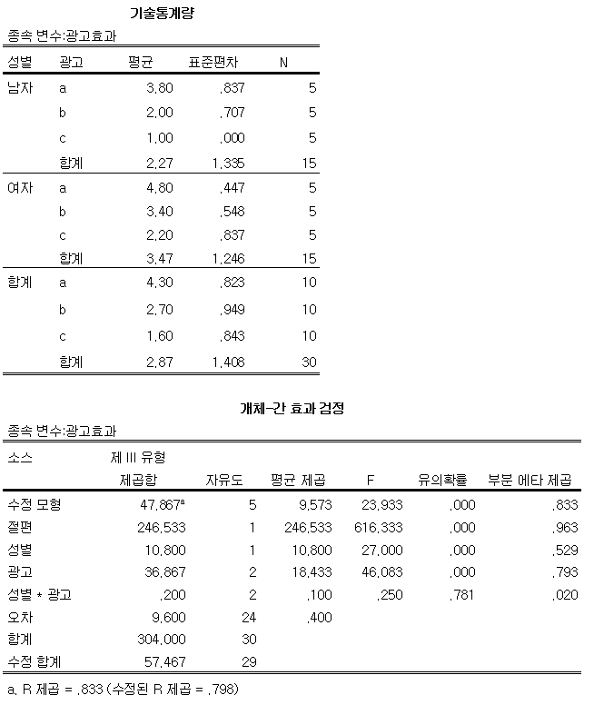 F는 0.250 p-value는 0.781로 나타났다. 따라서 상호작용 결과는 유의하지 않다. 광고대안들에 대한 태도는 성별에 따라 같다고 할 수 있다. 남자들보다 여자들의 광고태도가 더 호의적인 것으로 추정된다. (남=2.27 여=3.47)