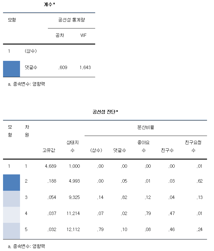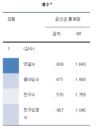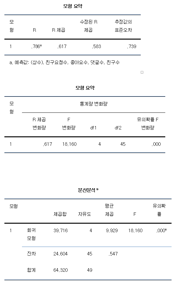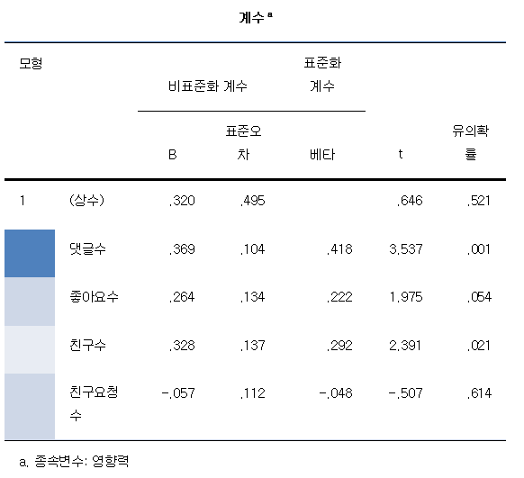 *결과: 회귀모형은 F값이 p=.000에서 18.160의 수치를 보이고 있다. 회귀식에 대한 R^2의 값이 0.617으로 61.7%의 설명력을 보이고 있다. SNS의 네트워크 사이즈와 네트워크 확장행위가 활동성에 영향을 미치는 데, 이 사이에 존재하는 상관관계가 유의할 것 이라는 가설의 검정 결과, 댓글 수에 따른 t값은 3.537, 좋아요 수에 따른 t값은 1.975, 친구 수에 따른 t값은 2.391로, 친구 요청 수에 따른 t값은 -0.507로 나타났다. 댓글 수와 친구수가 통계적 유의수준 하에서 영향을 미치는 것으로 나타났다.