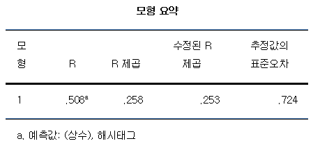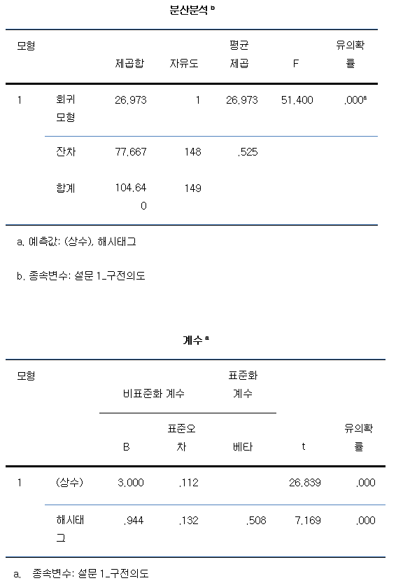 *결과: 회귀모형은 F값이 p=.000에서 51.400의 수치를 보이고 있다. 회귀식에 대한 R^2의 값이 0. 258으로 25.8%의 설명력을 보이고 있다. 해시태그의 사용이 구전 의도에 긍정적 의도를 미칠 것 이라는 가설의 검정 결과, t값은 7.169로 통계적 유의수준 하에서 영향을 미치지 않는 것으로 나타나 가설은 기각되었다.