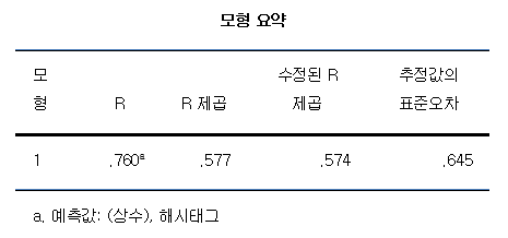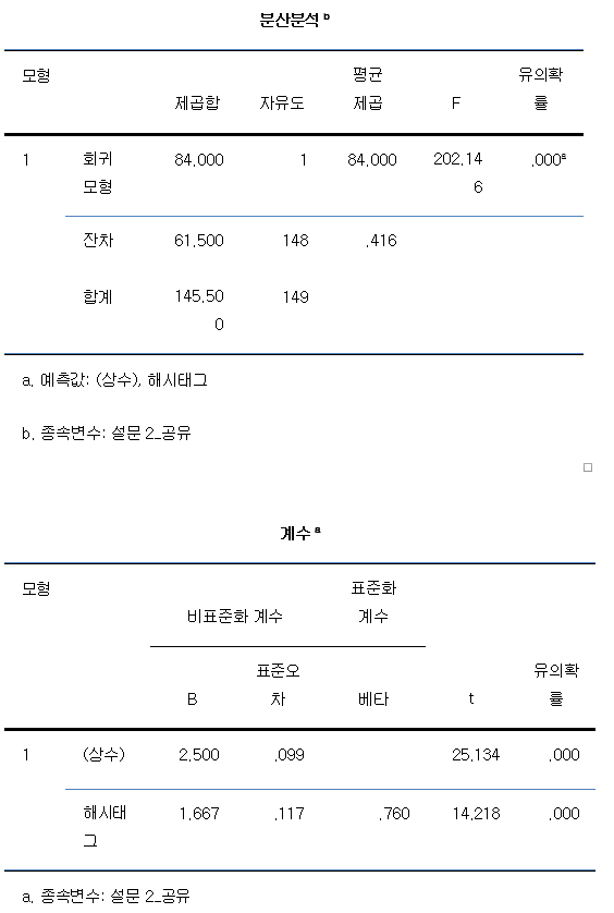 *결과: 회귀모형은 F값이 p=.000에서 202.146의 수치를 보이고 있다. 회귀식에 대한 R^2의 값이 0. 577으로 57.7%의 설명력을 보이고 있다. 해시태그의 사용이 구전 의도에 긍정적 의도를 미칠 것 이라는 가설의 검정 결과, t값은 14.218로 통계적 유의수준 하에서 영향을 미치는 것으로 나타나 가설은 채택되었다.