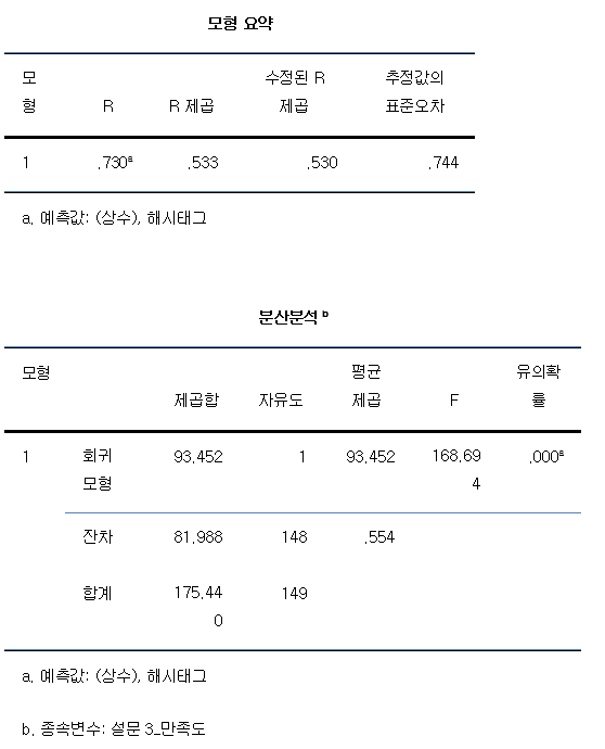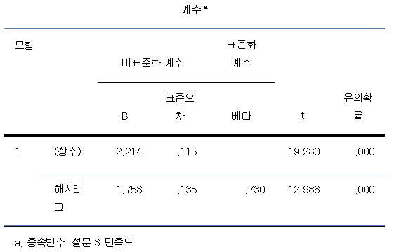 *결과: 회귀모형은 F값이 p=.000에서 168.694의 수치를 보이고 있다. 회귀식에 대한 R^2의 값이 0. 533으로 53.3%의 설명력을 보이고 있다. 해시태그의 사용이 구전 의도에 긍정적 의도를 미칠 것 이라는 가설의 검정 결과, t값은 12.988로 통계적 유의수준 하에서 영향을 미치는 것으로 나타나 가설은 채택되었다.