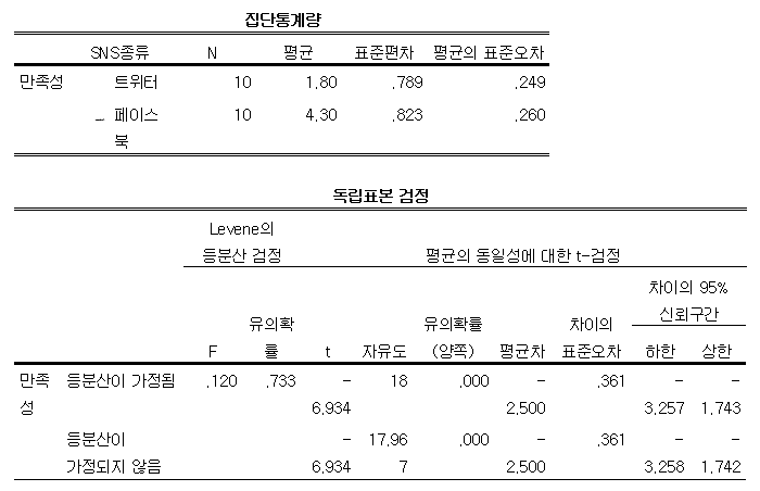 p-value는 .733로서 α=.05이기 때문에 영가설을 기각하지 못한다. 따라서 등분산 가정에 문제가 없다. 등분산 가정이 된 경우 양측검증에서 t-value가 6.934이고 p-value는 .000로 나타나 영가설은 α=.05에서 기각되지 않는다. 즉, SNS종류에 따른 광고의 만족도에 대한 차이는 있다고 할 수 없다.