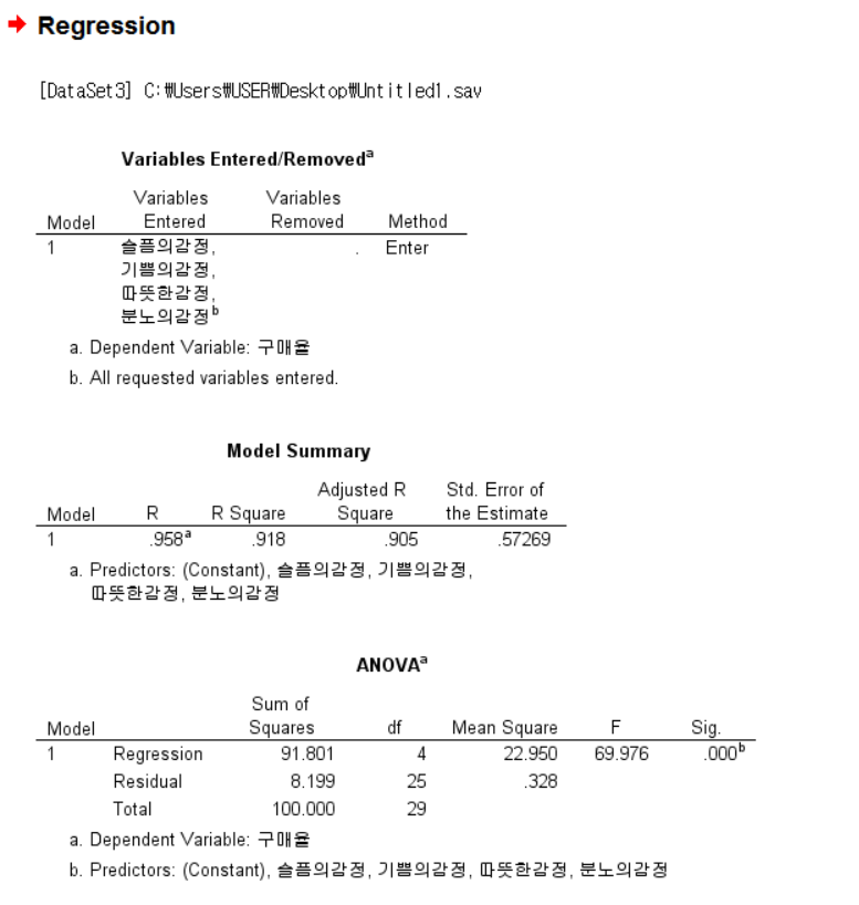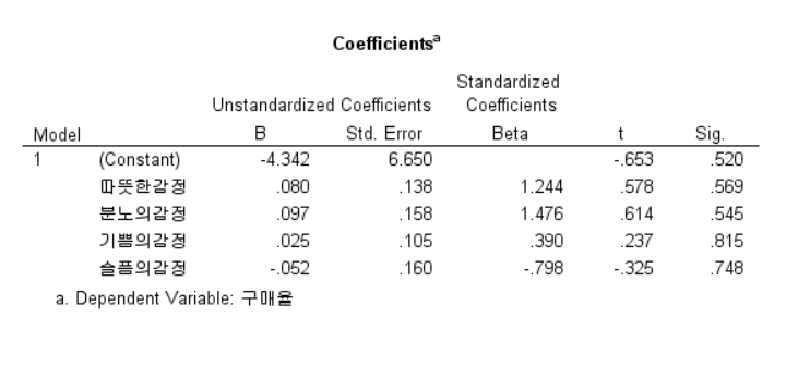 R값이 .958이고 R Square값이 .918이므로 슬픔의 감정, 기쁨의 감정, 따뜻한 감정, 분노의 감정이 구매율과 91.8%의 높은 상관관계에 있으므로, 가설 ‘혐오, 분노 등 특정한 부정적 감정요인을 유발시키지 않는 의류일수록 더 높은 판매율(구매율)을 나타낼 것이다’을 입증하고 있습니다.