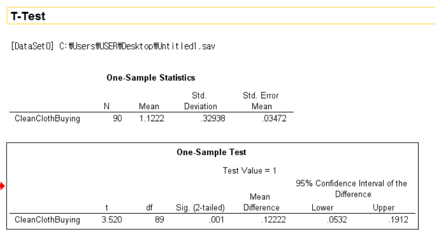 <t-test 결과> t값은 3.520이고 t critical value가 1.6622(0.05)입니다. t값이 t critical value보다 더 크기 때문에 95%확률로 가설을 입증 할 수 있었습니다