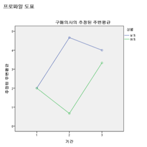 개체-간 효과 검정의 성별 * 기간 항목의 F값이 3.758, 유의확률이 .054로 가설이 성립되지 않는다. 즉 사용중인 스마트폰의 사용 기간과 성별에 따라 새 스마트폰 구매 의사에는 차이가 없다고 생각할 수 있다.(영가설 채택)