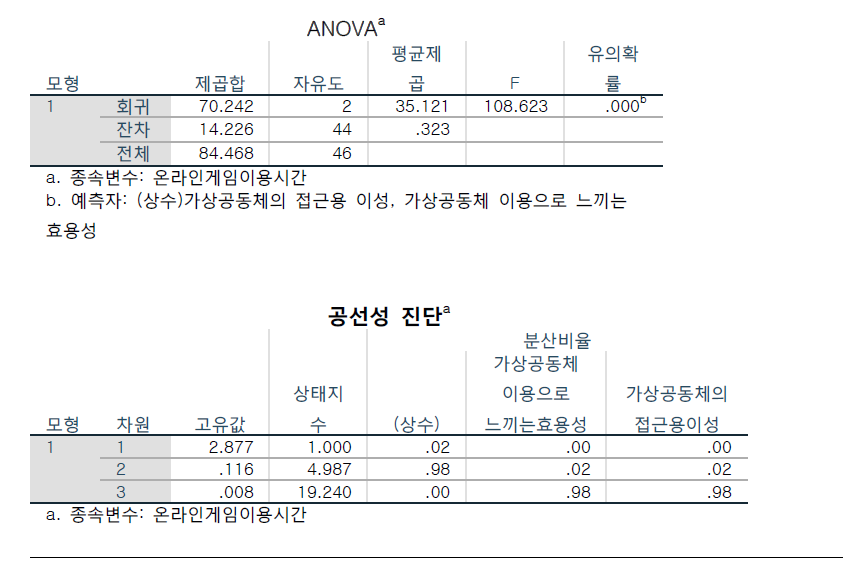 → 독립변인X1 : 가상공동체의 접근의 용이성 → 독립변인X2 : 가상공동체의 소속감에서 오는 효율성 → 종속변인Y : 온라인게임 이용시간