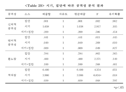 위의 표를 참고하여 시기, 집단에 따른 공격성 분석 결과를 살펴보면 적대감의 경우에는 집단에 따라서는 통계적으로 유의한 차이를 보이지 않았고,(F=4.354), 시기에 따라서는 사전(M=2.74)보다 사후(M=2.12)에서 적대감이 감소하여 시기에 따라 유의한 변화를 보였으나(F=6.834, p<.05), 시기와 집단의 상호작용의 경우에는 통계적으로 유의한 변화를 보이지 않았다.(F=.068). 신체적 공격성, 언어적 공격성, 분노감의 경우에는 집단, 시기, 시기와 집단의 상호작용 모두 통계적으로 유의한 차이를 보이지 않았다.