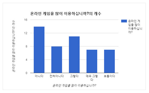 1. 온라인 게임을 많이 이용하십니까? 1)매우 그렇다 2)그렇다 3)보통이다 4)아니다 5)전혀 아니다 2. 한 달에 얼마나 온라인 게임에 접속을 하십니까? 1)매일 2)20일 이상 3)2주 4)거의안함 5)전혀 안함 3. 하루 몇 시간 게임에 접속하십니까? 1)하루 종일 2)16시간 이상 3)8시간 4)3시간 이하 5)1시간 이하 6)전혀 하지 않음 4. 현재 이용하는 온라인게임을 이용 전 주변인에게 추천을 받았습니까? 1) 추천받음 2) 추천 받지 않음 5. 주변인의 추천여부가 게임의 만족도에 영향을 끼친다고 생각하십니까? 1)매우 그렇다 2)그렇다 3)보통이다 4)아니다 5)전혀 아니다 6. 게임 이용 장르는 무엇입니까? 1)롤플레잉 게임 ex)이카루스, 던전 앤 파이터 2)퍼즐/보드게임 ex)테트리스 3)슈팅게임 ex)서든 어택, GTA 4)전략시뮬레이션 게임 ex)스타크래프트, 삼국지 11 5)스포츠 게임/Racing ex)피파온라인3,카트라이더 6)기타: 7. 귀하는 본 게임에서의 가상공동체(길드, 클랜, 파티 시스템 등)를 이용하십니까? 1) 그렇다 2) 아니다 8. 귀하는 가상공동체 시스템들이 게임 플레이에 도움을 준다고 생각합니까? 1)매우 그렇다 2)그렇다 3)보통이다 4)아니다 5)전혀 아니다 9. 귀하는 본 게임의 가상공동체 시스템에 가입 및 활동이 접근하기 쉽다고 생각하십니까? 1)매우 그렇다 2)그렇다 3)보통이다 4)아니다 5)전혀 아니다