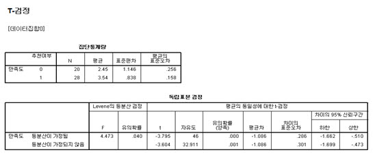 t-test분석으로 보아 유의확률이 0.05보다 낮아서 추천여부에 따라 게임만족도에 영향을 끼친다는 가설이 유의미 하다고 예측가능하다.
