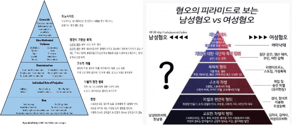 여성혐오란 여성을 남성과 동등한 주체로 인정하지 아니하는 여성의 타자화(직설적으로 여성 멸시), 객체화를 말한다. 여성을 한 개인으로 보기 보다는 여성이라는 집단으로 일반화를 시켜 그들의 문화나 취향 등을 비하하는 것 또한 여성혐오라고 할 수 있다. 여성혐오란 인터넷 온라인 상에서 주로 사용하는 말이었지만 초근엔 오프라인에서도 널리 쓰이면서 그것에 대한 문제제기가 이루어지고 있다. 전통적으로 남성중심사회에서 여성은 한 사람으로서의 주체로서 인정받기 보다는 남성들의 객체로서 대상화되어 왔다. 하지만 최근 현대사회에서는 여성들의 사회참여가 증가함에 따라 여성 또한 남성과 동등한 사람이라는 인식이 생기게 되었다. 그런 사회인식의 변화에도 불구하고 남성들의 여성의 대상화는 여전히 남아 있는 실정이다. 혐오의 피라미드를 살펴보면 혐오의 단계는 다음과 같다. 가장 아래 단계부터 편향, 개별적 편견 행위, 구조적 차별, 편견에 기반한 폭력, 제노사이드로 나누어진다. 위의 사진은 혐오피라미드를 기반으로 한 한국에서의 여성혐오의 모습을 보여준다. 주로 ‘일간베스트저장소’(일베), ‘오늘의 유머’(오유) 등과 같은 인터넷 커뮤니티에서 여성혐오 프레임은 생산과 재생산을 반복하였고 여성혐오의 언어로써 ‘된장녀’, ‘김치녀’, ‘여적여’ 등과 같은 편견을 여성에 대한 유발시키는 말들을 만들어내고 유행시키면서 여성혐오를 더욱 부추기는 역할을 하였다고 할 수 있다. 커뮤니티 사이트 ‘일베’에서 나타나는 여성혐오의 행태를 다음 논문에서 자세하게 살펴 볼 수 있다.