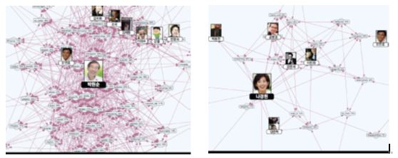 우리는 SNS를 통해서도 오피니언 리더(Opinion Leader)를 볼 수 있는데 이를 테면, 페이스북에서의 팔로워수가 굉장히 많은 페북스타, 또는 SNS를 자주 사용하는 공인들로 볼 수 있다. 이 SNS에서의 오피니언 리더들은 실제로 선거에도 영향을 미치는 것으로 나타났는데 대표적인 예를 들자면 2011년 10월 26일에 재보선 선거를 치뤘던 박원순 후보와 나경원 후보가 그 예이다. 그림2는 박원순 후보와 나경원 후보의 트위터 연결망을 나타낸 것이다.트위터를 분석대상으로 선정한 이유는 트위터는 많은 수의 지지자를 보유하면서 정보의 확산뿐만 아니라 의제설정이나 여론형성 과정 등에서 큰 영향력을 발휘하고 있기 때문이다. 그림2에서 오피니언 리더(이외수, 강풀, 김제동, 김미화 등)와 일반 트위터리안을 볼 수 있다. 그림을 통해서 한 눈에 박원순 후보의 밀도는 높고 대조적으로 나경원 후보의 밀도는 상당히 미약한 것을 볼 수 있다. 박원순 후보의 경우 오피니언리더뿐만 아니라 수많은 일반 트위터리안과 소통하고 있는 반면에 나경원 후보는 오피니언 리더는 물론 일반 트위터리안들과 소통이 많지 않았음을 볼 수 있다. 또한 SNS는 투표율에도 일조를 하였는데, 재보선 투표 당일날 오전에 저조했던 투표율이 SNS명사들의 투표 인증샷과 같은 활약으로 오후 들어 급상승하였다.