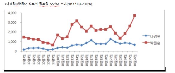 그림을 통해서 한 눈에 박원순 후보의 밀도는 높고 대조적으로 나경원 후보의 밀도는 상당히 미약한 것을 볼 수 있다. 박 후보의 경우 유력자인 파워 트위터리안(이외수, 강풀, 조국, 김제동, 김미화 등)뿐만 아니라 수많은 일반 트위터리안과 소통하고 있으며 나 후보의 경우 파워 트위터리안은 물론 일반 트위터리안과의 소통이 많지 않았음을 볼 수 있다. 또한 SNS는 투표율에도 일조를 하였다. 재보선 투표 당일, 오전에 저조했던 투표율이 SNS 명사들의 투표 인증샷과 같은 활약으로 오후 들어 급상승하였다.