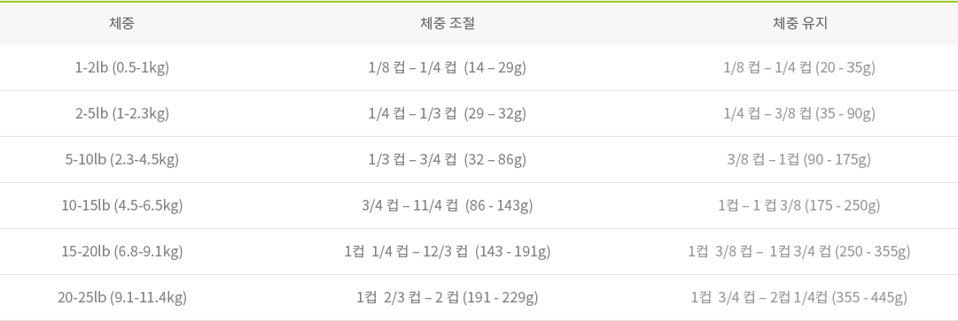 Eaglevet 수입회사는 grain free small breed puppy, adult, senior만 수입하는데, 급여량이 Petcurean과 차이가 있음.
