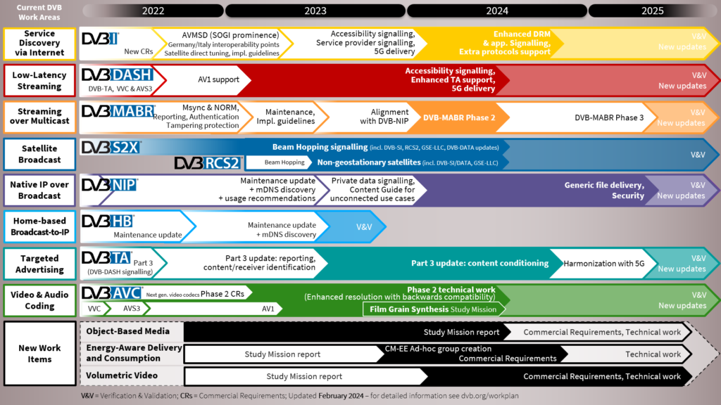 DVB (Digital Video Broadcasting Project) : The Digital Video Broadcasting Project is an industry-led consortium of over 200 broadcasters, manufacturers, network operators, software developers and regulators from around the world committed to designing open technical standards for the delivery of digital television. (https://www.dvb.org/about)