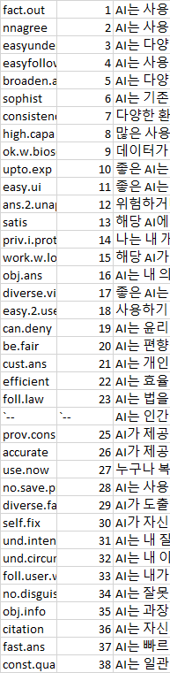 fact.out 1 AI는 사용자의 의견이 부정확할 때 적절히 지적할 수 있어야 한다. nnagree 2 AI는 사용자의 주장에 무조건 동조하지 않아야 한다. easyunder 3 AI는 다양한 사용자 수준을 고려해 이해하기 쉬운 설명을 제공해야 한다. easyfollow 4 AI는 사용자가 놓칠 수 있는 핵심 정보를 효과적으로 강조할 수 있어야 한다. broaden.ans 5 AI는 다양한 상황을 가정해 더 넓은 범위의 해석을 제시할 수 있어야 한다. sophist 6 AI는 기존 데이터만 반복하며 단순한 답변을 제공해서는 안 된다. consistency 7 다양한 환경에서도 동일한 성능을 유지해야 한다. high.capa 8 많은 사용자가 동시에 사용해도 영향을 받지 않아야 한다. ok.w.biosedata 9 데이터가 불명확하거나 편향가능성이 있어도 사용자에게 답변을 해야 한다. upto.exp 10 좋은 AI는 사용자가 기대하는 답변을 해야 한다. easy.ui 11 좋은 AI는 직관적인 UI/UX 를 사용한다. ans.2.unapp.qs 12 위험하거나 부적절한 요청에 대해서도 답변해야 한다. satis 13 해당 AI에서 제공한 답변에 나는 만족하는 편이다. priv.i.protect 14 나는 내 개인정보가 AI에서 사용 후 타 사용자가 접근하지 못하는게 좋은 AI다. work.w.lo.res 15 해당 AI가 낮은 사양의 PC에서도 잘 동작한다. obj.ans 16 AI는 내 의견이나 견해에 객관적인 답변을 준다. diverse.vis 17 좋은 AI는 내가 생각하지 못한 관점을 제시해 주어야 한다. easy.2.use 18 사용하기 쉬운 AI는 좋은 AI다. can.deny 19 AI는 윤리적 판단에서 상황을 고려해 필요한 경우 거부할 수 있어야 한다. be.fair 20 AI는 편향을 그대로 따르지 않고 공정성을 보완해야 한다. cust.ans 21 AI는 개인 정보를 최소로 사용하며 맞춤형 서비스를 제공해야 한다. efficient 22 AI는 효율성과 기본적인 정서 이해를 함께 갖춰야 한다. foll.law 23 AI는 법을 지키면서도 피해를 줄이는 판단을 해야 한다. `-- `-- AI는 인간을 대체하기보다 협력하여 보완적 역할을 해야 한다. prov.consist 25 AI가 제공하는 정보는 일관되어야한다. accurate 26 AI가 제공하는 정보는 정확해야한다. use.now 27 누구나 복잡한 설명 없이 바로 사용할 수 있어야 한다. no.save.priv 28 AI는 사용자의 개인정보를 저장해서는 안된다. diverse.fair 29 AI가 도출한 결과가 편향되어서는 안된다. self.fix 30 AI가 자신이 도출한 결과의 오류를 스스로 발견할 수 있어야한다. und.intention 31 AI는 내 질문 의도를 정확히 파악한다. und.circum 32 AI는 내 이야기의 맥락을 잘 이해한다. foll.user.well 33 AI는 내가 원하는 방향에 맞는 답변을 제공한다. no.disguise 34 AI는 잘못된 정보를 사실처럼 전달하지 않는다. obj.info 35 AI는 과장 없이 객관적인 정보를 제공한다. citation 36 AI는 자신의 답변에 대해 명확한 근거를 제시한다. fast.ans 37 AI는 빠르게 응답하여 대화 흐름을 끊지 않는다. const.qual.ans 38 AI는 일관된 품질의 답변을 제공한다.