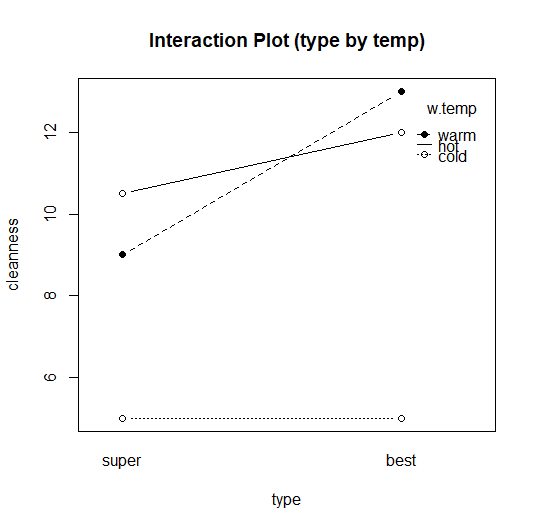 그러나, 사실 위의 표의 해석이 그리 직관적이지는 않다. 상호의존적이라는 단어가 의미하는 것이 그리 직관적이지 않기 때문이다. 이럴 경우, 흔히 연구자는 위의 표를 아래와 같은 도표로 바꾸어 살펴보게 되는데, 이렇게 하는 이유는 상호효과(InteractionEffect)의 존재여부가 완연히 들어나기 때문이다.