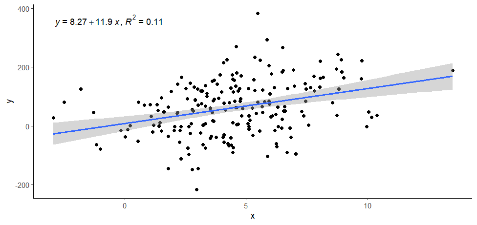 > y <- slp * x + rnorm(nx, 0, slp*sdx*3)