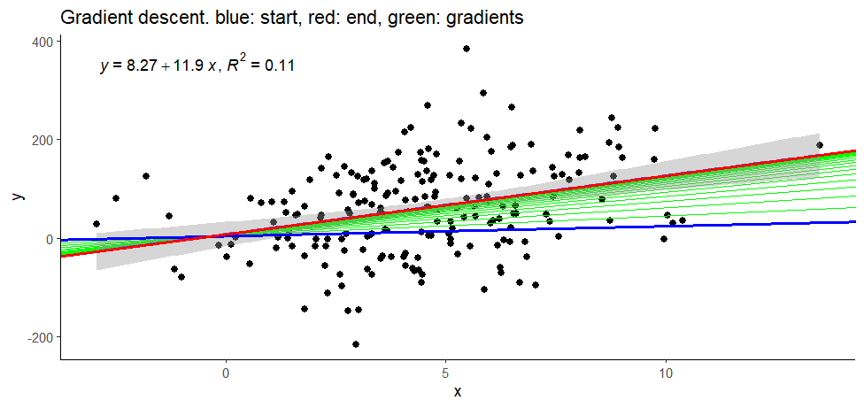 + labs(title = 'Gradient descent. blue: start, red: end, green: gradients')