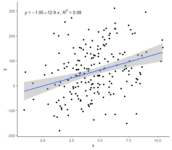 > y <- slp * x + rnorm(nx, 0, slp*sdx*3)