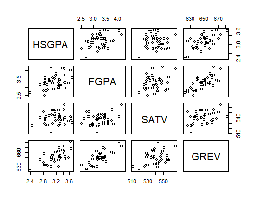options(digits = 4) HSGPA <- c(3.0, 3.2, 2.8, 2.5, 3.2, 3.8, 3.9, 3.8, 3.5, 3.1) FGPA <- c(2.8, 3.0, 2.8, 2.2, 3.3, 3.3, 3.5, 3.7, 3.4, 2.9) SATV <- c(500, 550, 450, 400, 600, 650, 700, 550, 650, 550) scholar <- data.frame(FGPA, HSGPA, SATV) # collect into a data frame describe(scholar) # provides descrptive information about each variable corrs <- cor(scholar) # find the correlations and set them into an object called 'corrs' corrs # print corrs pairs(scholar) # pairwise scatterplots