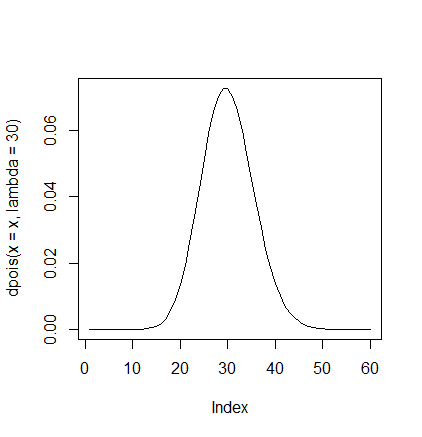 > x <- c(1:60) > dpois(x=x, lambda=30) [1] 2.807287e-12 4.210930e-11 4.210930e-10 3.158198e-09 [5] 1.894919e-08 9.474593e-08 4.060540e-07 1.522702e-06 [9] 5.075675e-06 1.522702e-05 4.152825e-05 1.038206e-04 [13] 2.395861e-04 5.133987e-04 1.026797e-03 1.925245e-03 [17] 3.397491e-03 5.662486e-03 8.940767e-03 1.341115e-02 [21] 1.915879e-02 2.612562e-02 3.407689e-02 4.259611e-02 [25] 5.111534e-02 5.897924e-02 6.553248e-02 7.021338e-02 [29] 7.263453e-02 7.263453e-02 7.029148e-02 6.589826e-02 [33] 5.990751e-02 5.285957e-02 4.530820e-02 3.775683e-02 [37] 3.061365e-02 2.416867e-02 1.859128e-02 1.394346e-02 [41] 1.020253e-02 7.287524e-03 5.084319e-03 3.466581e-03 [45] 2.311054e-03 1.507209e-03 9.620485e-04 6.012803e-04 [49] 3.681308e-04 2.208785e-04 1.299285e-04 7.495876e-05 [53] 4.242949e-05 2.357194e-05 1.285742e-05 6.887904e-06 [57] 3.625212e-06 1.875110e-06 9.534457e-07 4.767229e-07 > plot(dpois(x=x, lambda=30), type = "l") # 아래 그림 참조 > dpois(x=30, lambda=30) [1] 0.07263453 >