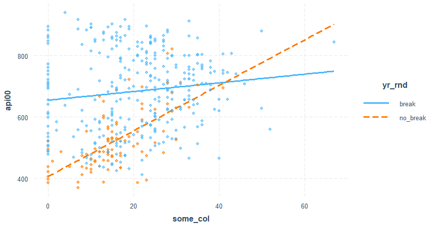 > # mod6 <- lm(api00 ~ yr_rnd * some_col, data=datavar)