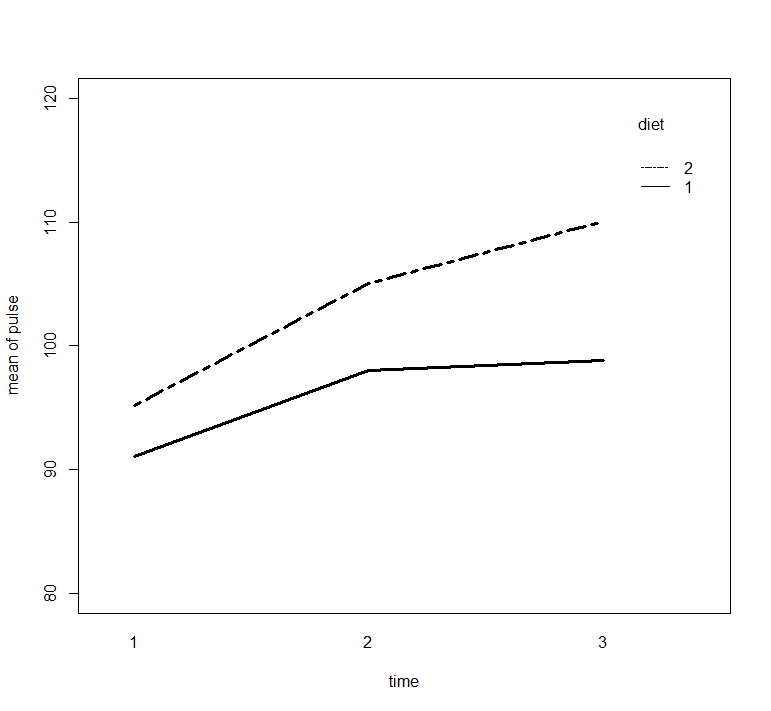 + ylab = "mean of pulse", xlab = "time", trace.label = "diet"))