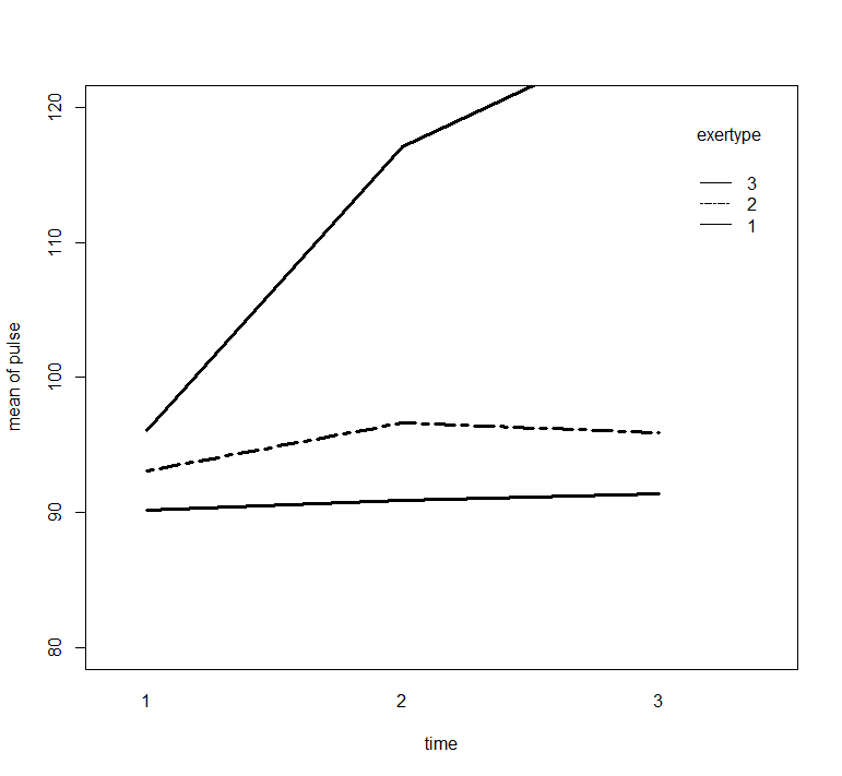 + ylab = "mean of pulse", xlab = "time", trace.label = "exertype"))