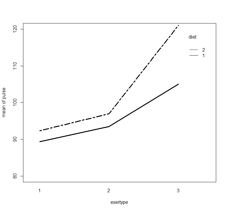 + ylab = "mean of pulse", xlab = "exertype", trace.label = "diet"))