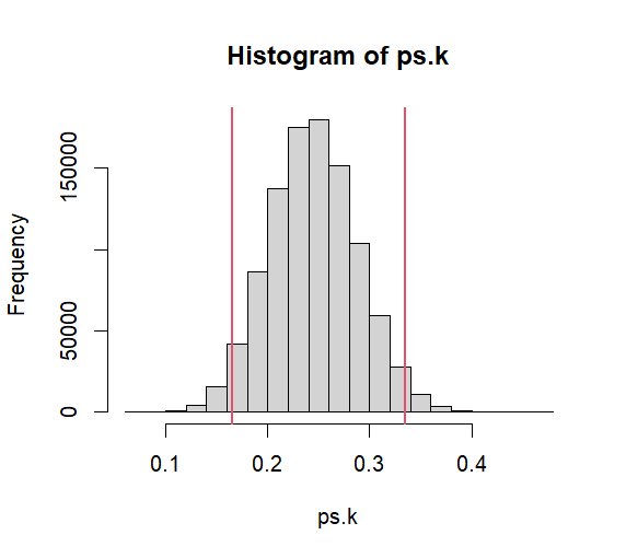 > set.seed(101) > k <- 1000 > n <- 100 > p <- 1/4 > q <- 1-p > # in order to clarify what we are doing > # X~B(n,p) 일 때, 100개의 검볼을 샘플링해서 > # red gumball을 세봤더니 > rbinom(1,n,p) # 24개 였다라는 뜻 [1] 24 > > # 아래는 이것을 1000번 (k번) 한 것 > numbers.of.red.gumball <- rbinom(k, n, p) > head(numbers.of.red.gumball) [1] 18 27 27 22 23 26 > > # 아래처럼 n으로 (100개의 검볼이 총 숫자이므로) > # 나눠주면 비율을 구할 수 있다 > proportions.of.rg <- numbers.of.red.gumball/n > ps.k <- proportions.of.rg > head(ps.k) [1] 0.18 0.27 0.27 0.22 0.23 0.26 > > mean.ps.k <- mean(ps.k) > mean.ps.k [1] 0.24893 > hist(ps.k) > > > #### > set.seed(101) > k <- 1000000 > n <- 100 > p <- 1/4 > q <- 1-p > numbers.of.red.gumball <- rbinom(k, n, p) > > # 아래처럼 n으로 (100개의 검볼이 총 숫자이므로) > # 나눠주면 비율을 구할 수 있다 > proportions.of.rg <- numbers.of.red.gumball/n > ps.k <- proportions.of.rg > mean.ps.k <- mean(ps.k) > mean.ps.k # 위에서 구한 시뮬레이션 샘플들의 평균 [1] 0.2500216 > > mean.value <- n * p # 이론적인 샘플비율들의 평균 > mean.value [1] 25 > > # variance? > var.cal <- var(ps.k) # 위에서 구한 시뮬레이션 샘플들의 분산 > var.cal [1] 0.001869 > var.value <- (p*q)/n # 교재가 증명한 이론적인 샘플비율들의 분산값 > var.value [1] 0.001875 > > # standard deviation > sd.cal <- sqrt(var.cal) > sd.cal [1] 0.04323193 > sd.value <- sqrt(var.value) > sd.value [1] 0.04330127 > > se <- sd.value > # 우리는 standard deviation of sample > # proportions을 standard error라고 부른다 > > # 위의 histogram 에서 mean 값은 이론적으로 > p [1] 0.25 > # standard deviation값은 > se [1] 0.04330127 > > qnorm(.975) [1] 1.959964 > # 우리는 평균값에서 +- 2*sd.cal 구간이 95%인줄 안다. > se2 <- se * qnorm(.975) > # 즉, 아래 구간이 > lower <- p-se2 > upper <- p+se2 > lower [1] 0.1651311 > upper [1] 0.3348689 > > hist(ps.k) > abline(v=lower, col=2, lwd=2) > abline(v=upper, col=2, lwd=2) > > a <- pnorm(lower, mean=p, sd=se) > b <- pnorm(upper, p, se) > b-a [1] 0.95 > lower [1] 0.1651311 > upper [1] 0.3348689 > > # 위의 그래프가 의미하는 것은 rbinom(1, n, p) / n로 > # 얻은 하나의 샘플의 proportion의 (비율) 값은 > # 95/100 확률로 lower에서 upper사이에 있을 것이라는 > # 뜻 > rbinom(1, n, p)/n [1] 0.29 > rbinom(1, n, p)/n [1] 0.24 > > k <- 100 > sa1 <- rbinom(k, n, p) / n > head(sa1) [1] 0.29 0.29 0.23 0.23 0.27 0.29 > sa1 < lower [1] FALSE FALSE FALSE FALSE FALSE FALSE FALSE FALSE FALSE FALSE TRUE [12] FALSE FALSE FALSE FALSE FALSE FALSE FALSE FALSE TRUE FALSE FALSE [23] FALSE FALSE FALSE FALSE FALSE TRUE FALSE FALSE FALSE FALSE FALSE [34] FALSE FALSE FALSE FALSE FALSE FALSE FALSE FALSE FALSE FALSE FALSE [45] TRUE FALSE FALSE FALSE FALSE FALSE FALSE FALSE FALSE FALSE FALSE [56] FALSE FALSE FALSE FALSE FALSE FALSE FALSE FALSE FALSE FALSE FALSE [67] FALSE FALSE FALSE FALSE FALSE FALSE FALSE FALSE FALSE FALSE FALSE [78] FALSE FALSE FALSE FALSE FALSE FALSE FALSE FALSE FALSE FALSE FALSE [89] FALSE FALSE FALSE FALSE FALSE FALSE FALSE FALSE FALSE FALSE FALSE [100] FALSE > sa1 > upper [1] FALSE FALSE FALSE FALSE FALSE FALSE FALSE FALSE FALSE FALSE FALSE [12] FALSE FALSE FALSE FALSE FALSE FALSE FALSE FALSE FALSE FALSE FALSE [23] TRUE FALSE FALSE FALSE FALSE FALSE FALSE FALSE FALSE FALSE FALSE [34] FALSE FALSE FALSE FALSE FALSE FALSE FALSE FALSE FALSE FALSE FALSE [45] FALSE FALSE FALSE FALSE FALSE FALSE FALSE FALSE FALSE FALSE FALSE [56] FALSE FALSE FALSE FALSE FALSE FALSE FALSE FALSE FALSE FALSE FALSE [67] FALSE FALSE FALSE FALSE FALSE FALSE FALSE FALSE FALSE FALSE FALSE [78] FALSE FALSE FALSE FALSE FALSE FALSE FALSE FALSE FALSE FALSE FALSE [89] FALSE FALSE FALSE FALSE FALSE FALSE FALSE FALSE FALSE FALSE FALSE [100] FALSE > table(sa1 < lower) FALSE TRUE 96 4 > table(sa1 > upper) FALSE TRUE 99 1 > > table(sa1 < lower | sa1 > upper) FALSE TRUE 95 5 > table(sa1 < lower | sa1 > upper) / k FALSE TRUE 0.95 0.05 >