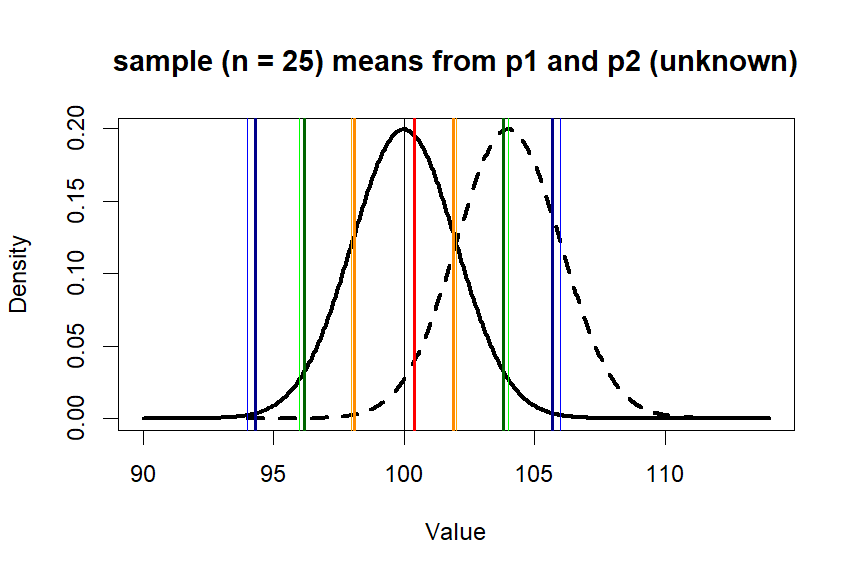 + main = paste0("sample (n = ",n.s, ") means from p1 and p2 (unknown)"),