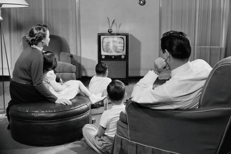 - FAMILY WATCHES TV IN LIVING ROOM IN THE 1950'S