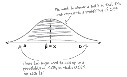 위에서 얻은 $\overline{X} \sim N(\mu, 0.25)$를 가정하고 아래의 a, b 구간을 95%라고 하면, 양 쪽 끝은 각각, 0.025 씩이 될 것이다.
