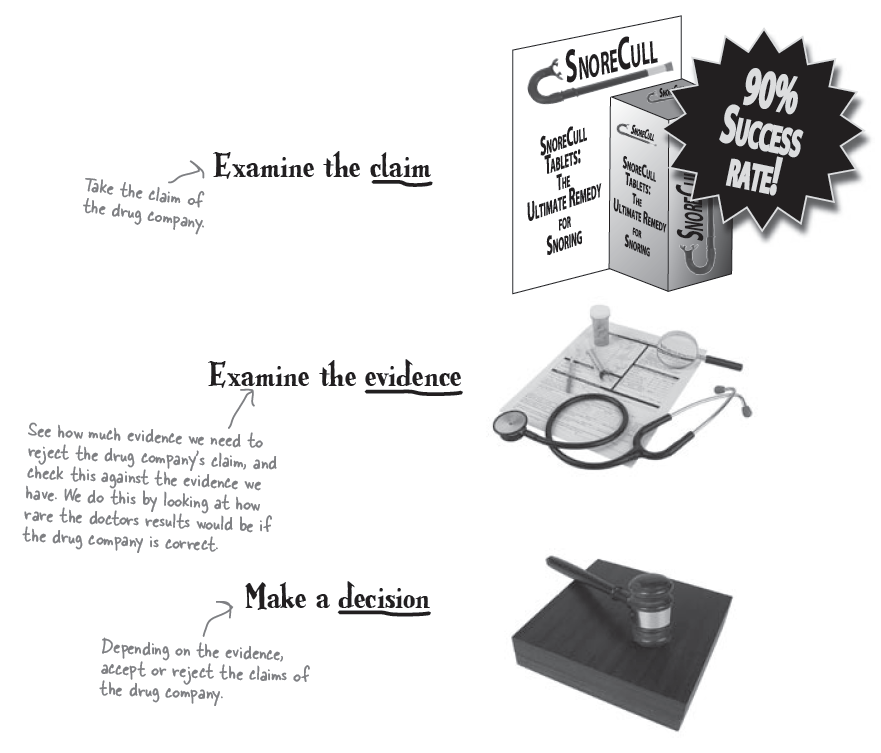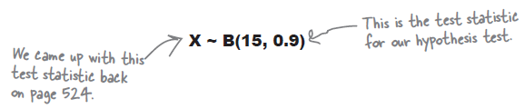 A: 제약회사의 말이 맞다면 .9 (90%) 치료율을 보여야 하기 때문에, 15명의 .9인 13.5명, 이를 반올림한 14명이 치료되어야 한다. 그런데, 이번 샘플에서의 치료된 환자의 숫자는 11이었다. 이를 어떻게 해석하고 판단해야 하는가?