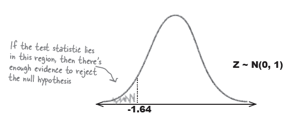위의 그림처럼 -3.33은 영가설 기각기준 왼 쪽에 존재하므로 – > P(X < -1.64) = 0.05 라는 이야기인데, 내가 구한 z 값은 -3.33 이므로 이 0.05 구간 안에 존재한다. 즉, 80점의 평균을 얻을 확률이 아주 낮다는 (1/20보다 낮다는) 이야기이므로 영가설인, 샘플의 평균인 80점이 모집단의 평균에서 나왔다는 것을 (같을 것이라는 것을) 부정한다 (혹은 기각한다). 즉, 회사의 claim 인 90% cure를 받아들이지 못한다.